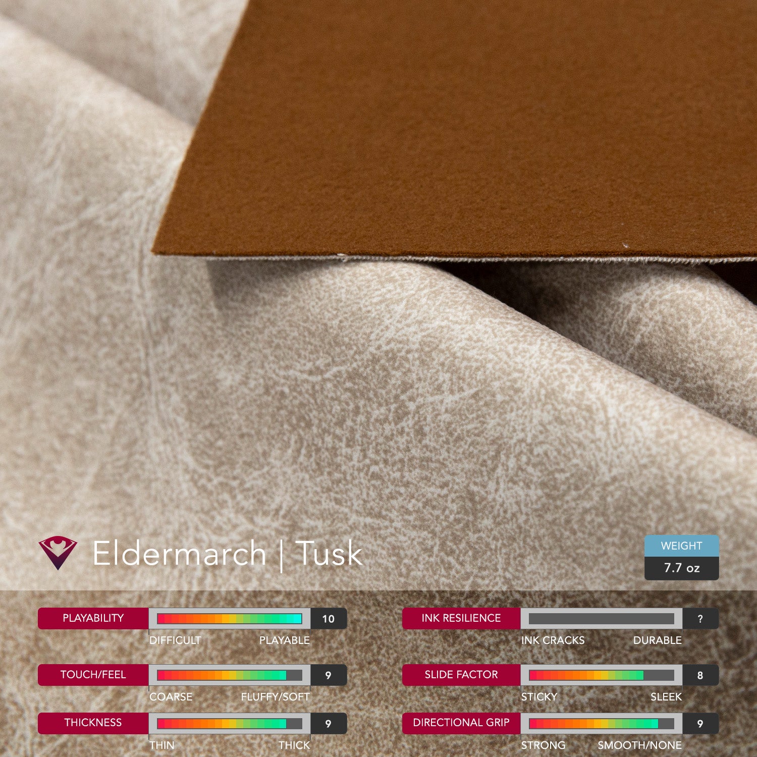 At 7.7 oz, Eldermarch is like a thicker, denser Edencloth. Cards glide effortlessly and luxuriously against its surface. Aesthetically, we struggle to find its equal. The marbly texture is an attention grabber and a joy to behold.