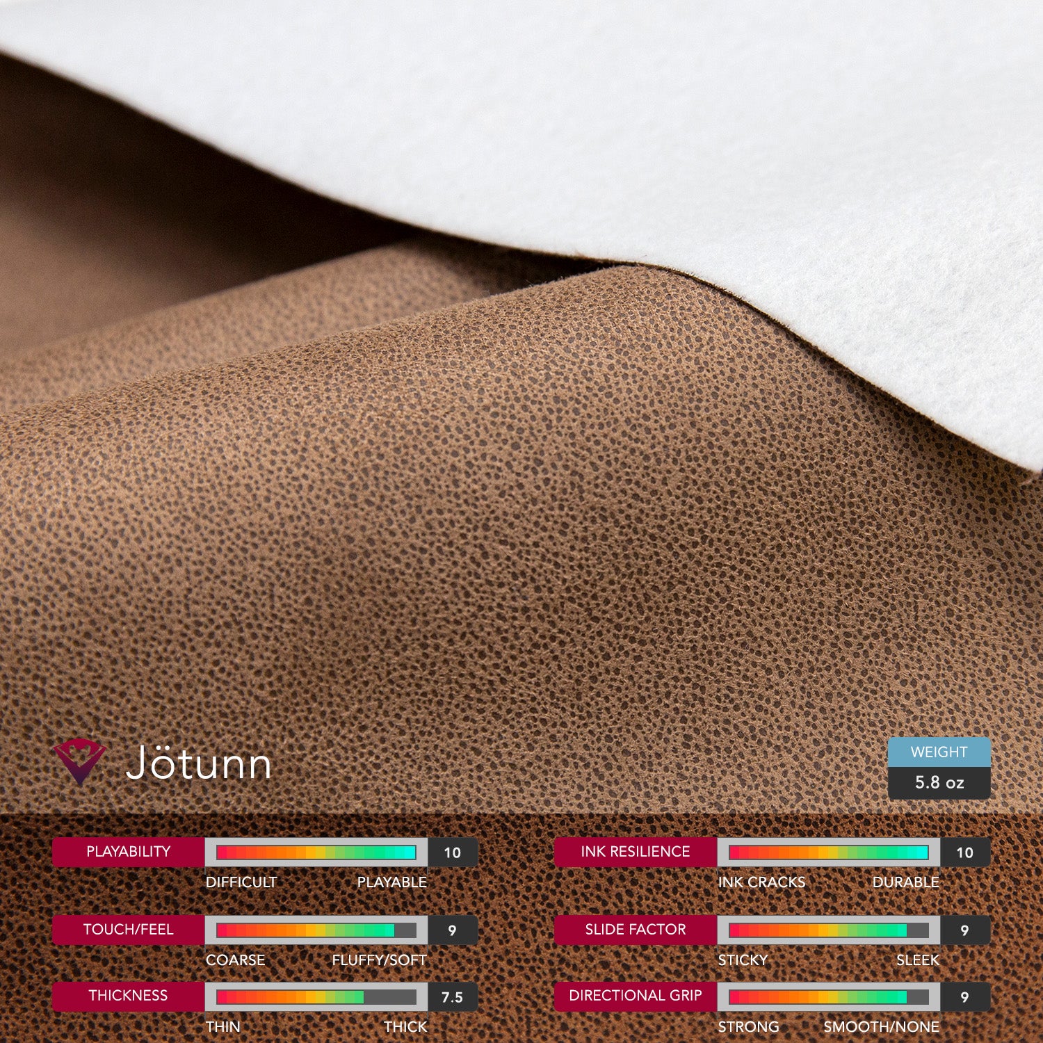 Jötunn is a dream cloth that defies expectation. At first glance, we mistook it for vinyl as its textured surface mimics the appearance of common vinyl plastics. But the moment we touched it, we were floored. It feels like a softer, silkier Wyvernhide, allowing your hands and cards to glide beautifully across its surface.