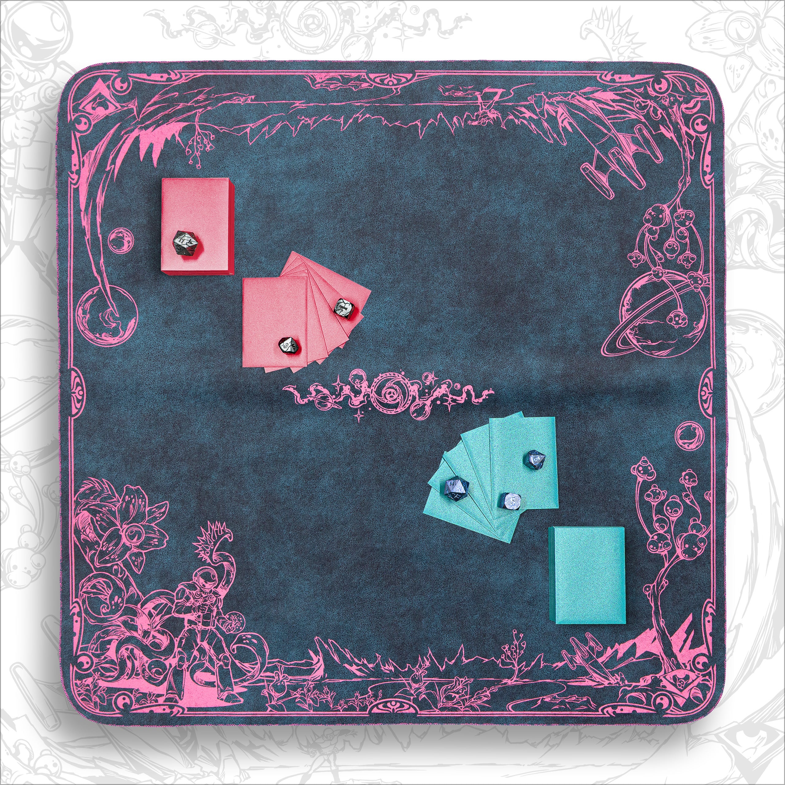We are proud to continue our collaboration with Spellground and Khalsa Brain Games with Echoes of Orion, an interstellar tribute to Spellground’s legendary Orion playmat from 1995.